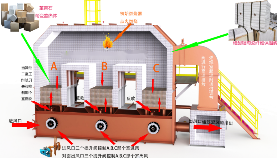 階段二:廢氣通過蓄熱床B被預熱,然后進入燃燒室燃燒,蓄熱床A中殘留未處理廢氣被凈化后的氣體反吹回燃燒室進行焚燒處理,分解后廢氣經過蓄熱床C排出,同時蓄熱床C被加熱。