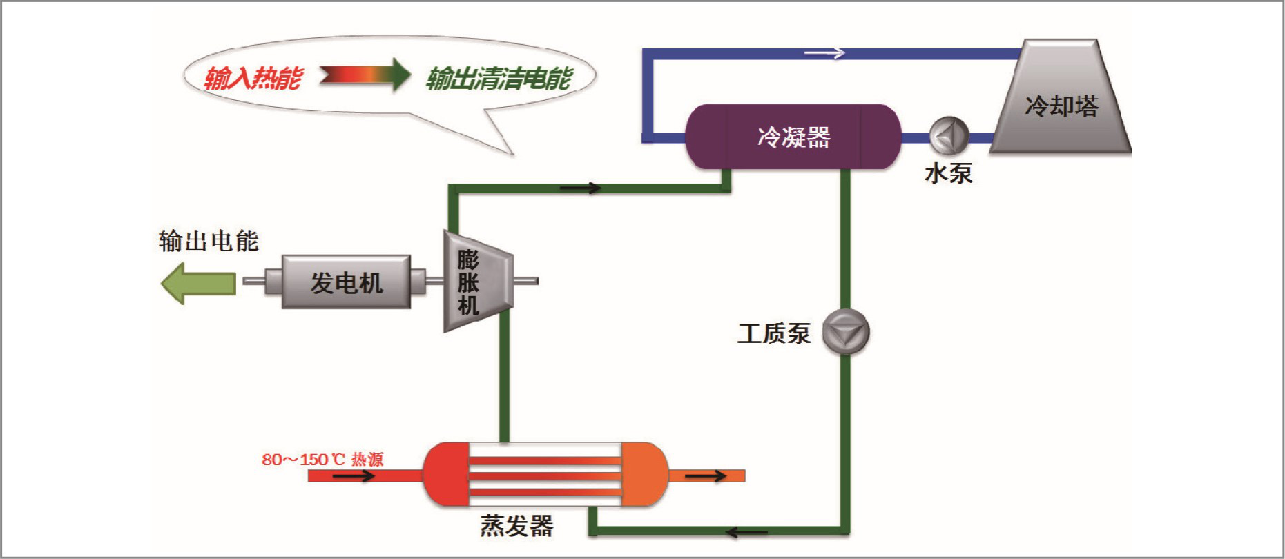 效率高:對較低溫度熱源的利用有更高的效率,最大程度地利用80~140℃的低溫熱;